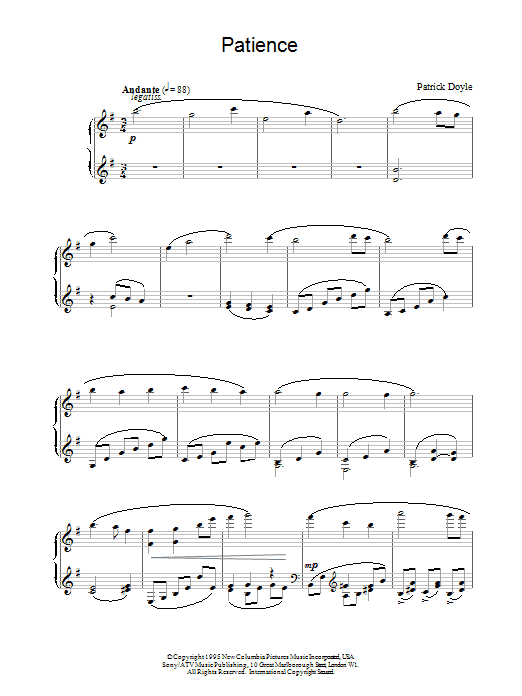 Download or print Patrick Doyle Patience sheet music, chords and digital score arranged for Piano Solo. This Film/TV score includes 2 page(s).
