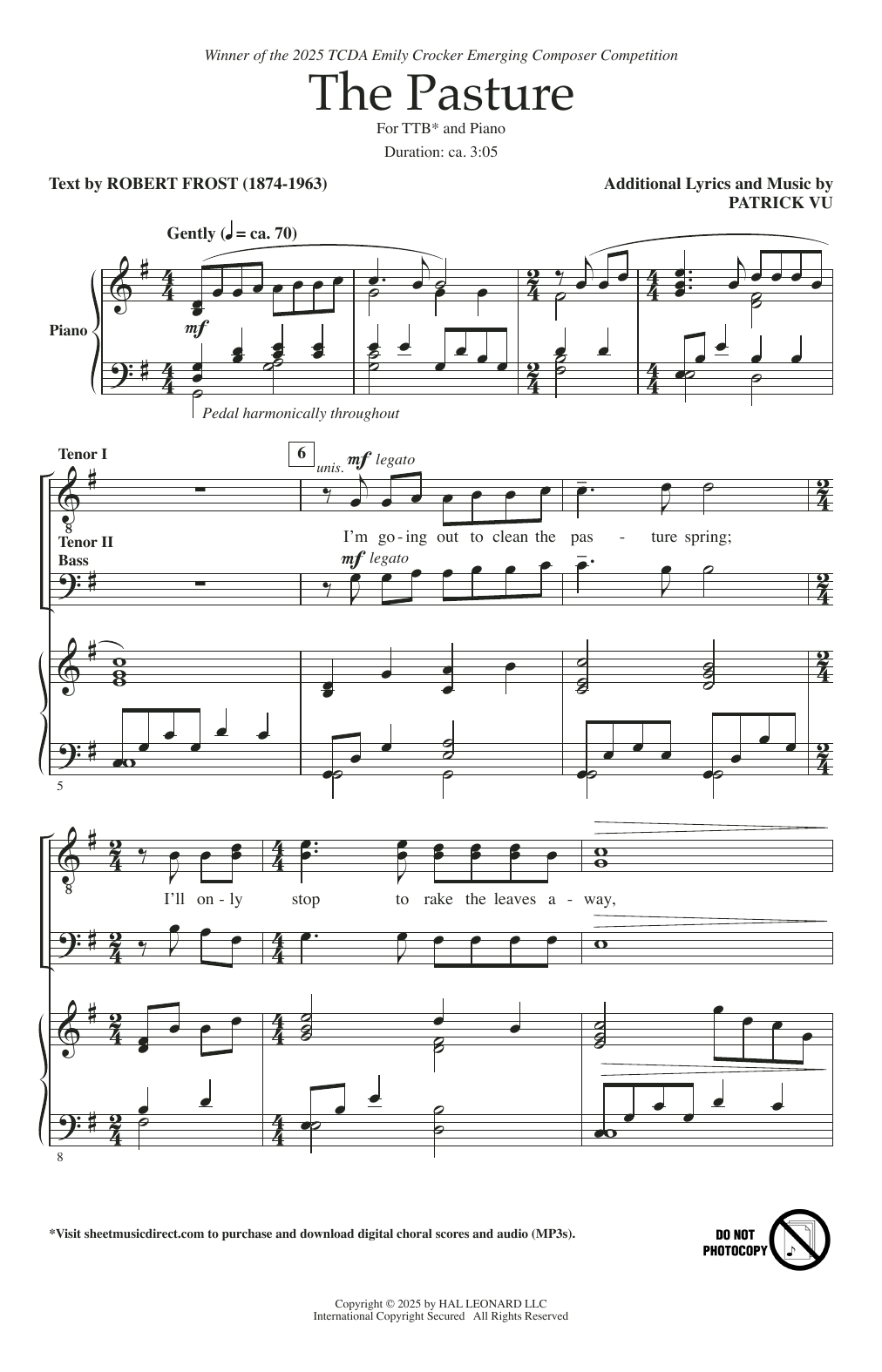Download or print Patrick Vu The Pasture sheet music, chords and digital score arranged for Choir. This Concert score includes 7 page(s).