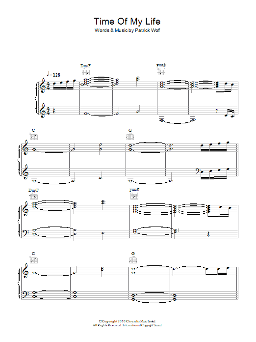 Download or print Patrick Wolf Time Of My Life sheet music, chords and digital score arranged for Piano, Vocal & Guitar Chords. This Pop score includes 8 page(s).