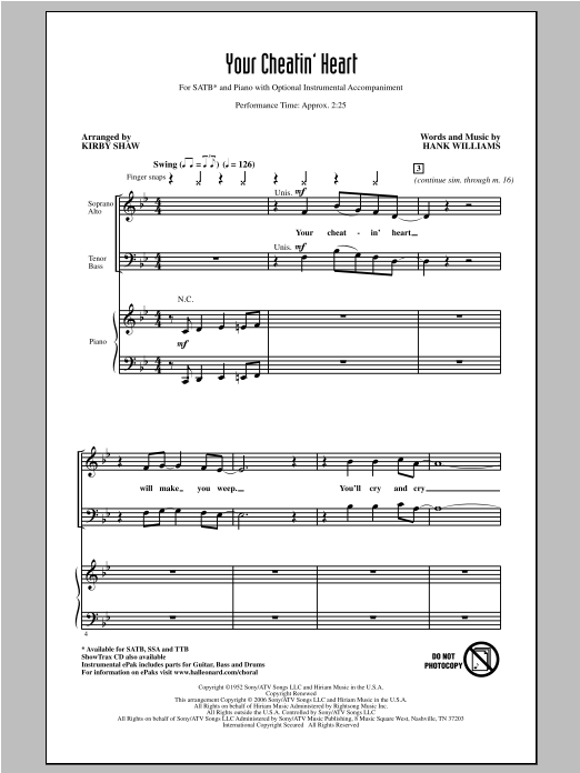 Download or print Kirby Shaw Your Cheatin' Heart sheet music, chords and digital score arranged for SATB Choir. This Country score includes 7 page(s).