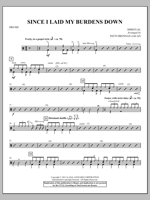 Download or print Patti Drennan Since I Laid My Burdens Down - Drum Set sheet music, chords and digital score arranged for Choir Instrumental Pak. This Concert score includes 2 page(s).