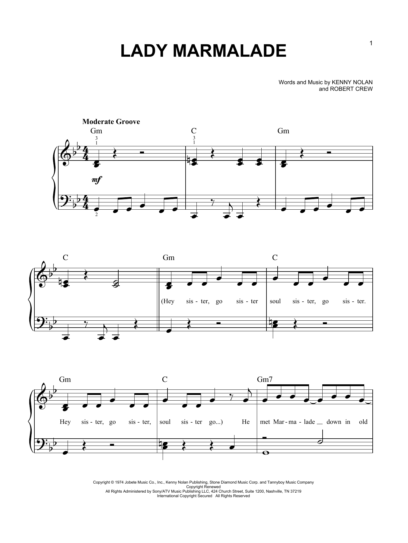 Download or print Patti LaBelle Lady Marmalade sheet music, chords and digital score arranged for Piano, Vocal & Guitar Chords (Right-Hand Melody). This Disco score includes 6 page(s).
