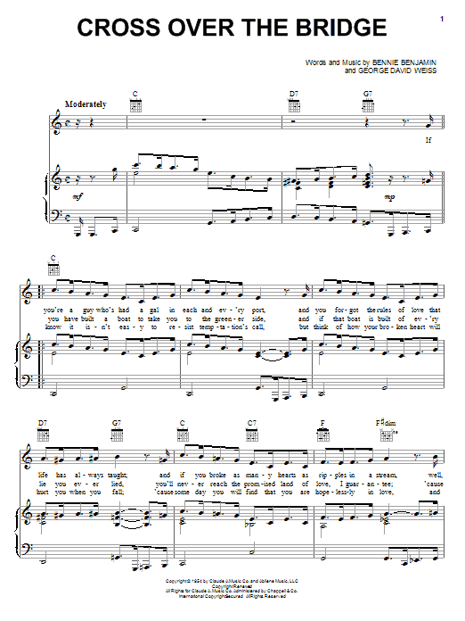 Download or print Patti Page Cross Over The Bridge sheet music, chords and digital score arranged for Piano, Vocal & Guitar Chords. This Country score includes 3 page(s).
