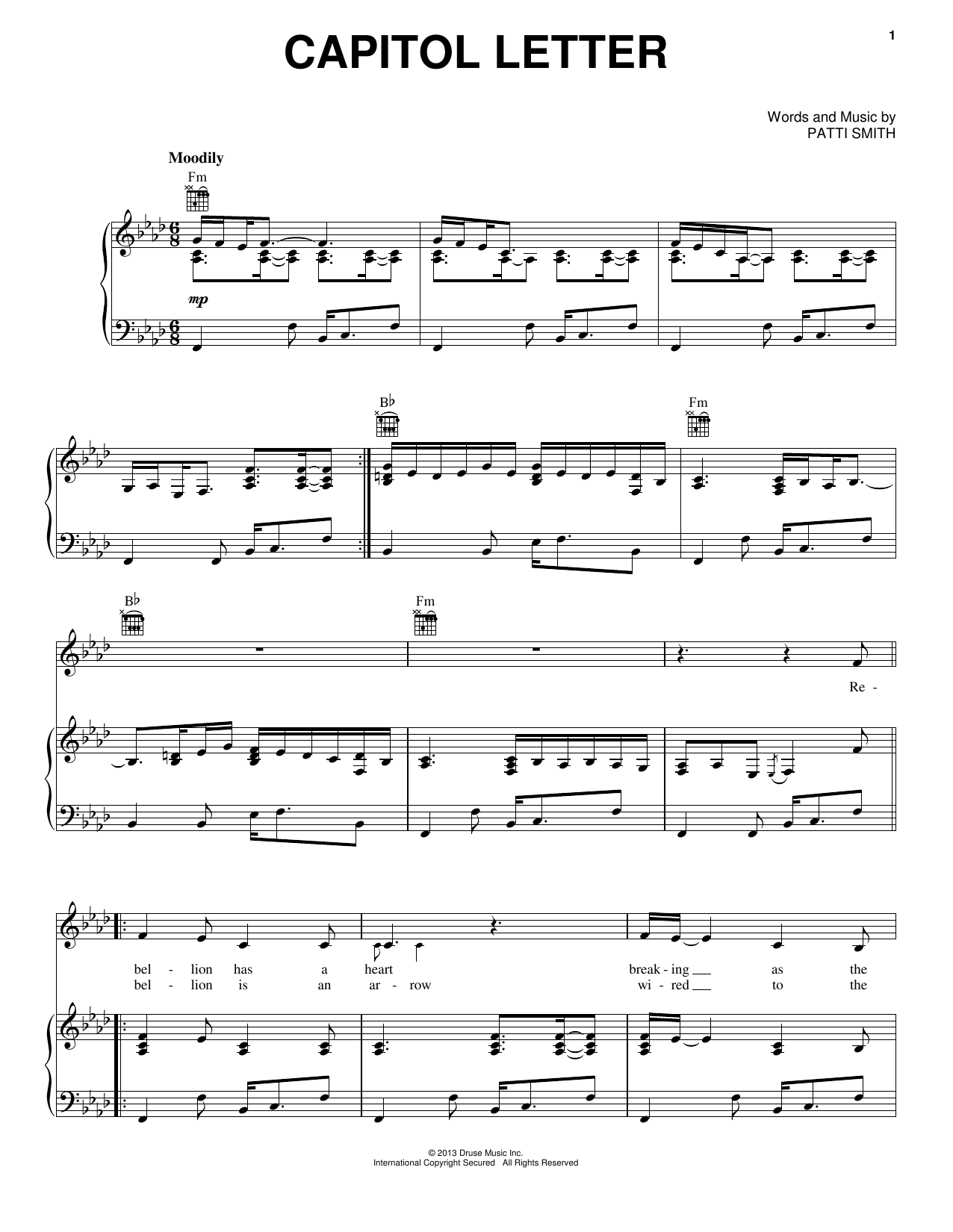 Download or print Patti Smith Capitol Letter sheet music, chords and digital score arranged for Piano, Vocal & Guitar Chords (Right-Hand Melody). This Pop score includes 4 page(s).
