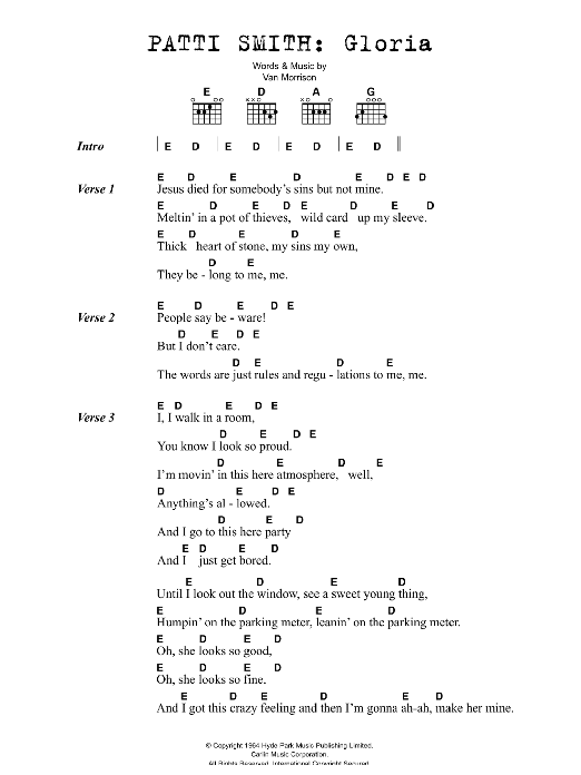 Download or print Patti Smith Gloria sheet music, chords and digital score arranged for Guitar Chords/Lyrics. This Rock score includes 4 page(s).