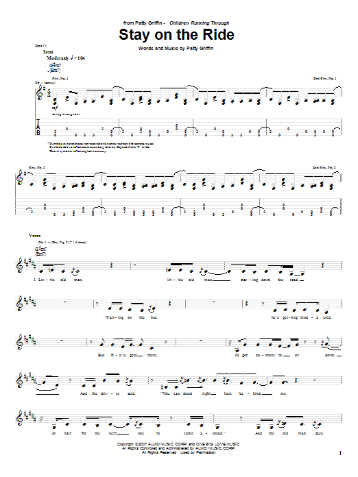 Download or print Patty Griffin Stay On The Ride sheet music, chords and digital score arranged for Guitar Tab. This Folk score includes 6 page(s).