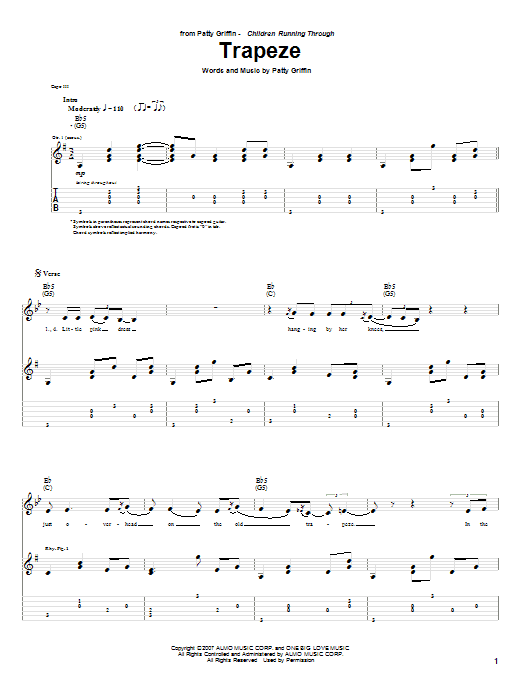 Download or print Patty Griffin Trapeze sheet music, chords and digital score arranged for Guitar Tab. This Folk score includes 8 page(s).