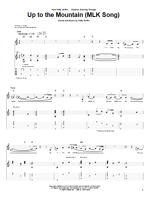 Download or print Patty Griffin Up To The Mountain (MLK Song) sheet music, chords and digital score arranged for Piano, Vocal & Guitar Chords (Right-Hand Melody). This Folk score includes 5 page(s).
