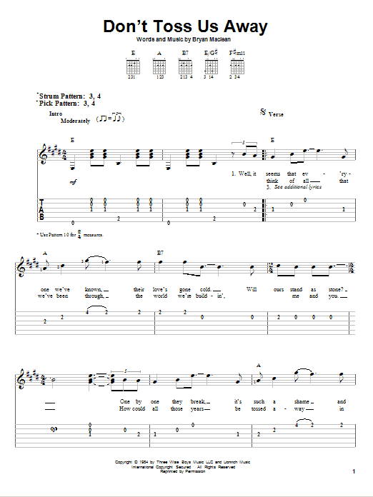 Download or print Patty Loveless Don't Toss Us Away sheet music, chords and digital score arranged for Piano, Vocal & Guitar Chords (Right-Hand Melody). This Country score includes 4 page(s).