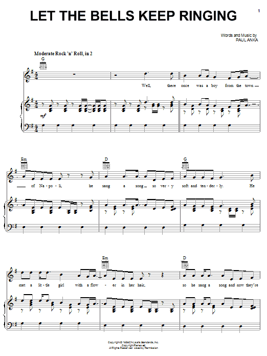 Download or print Paul Anka Let The Bells Keep Ringing sheet music, chords and digital score arranged for Piano, Vocal & Guitar Chords (Right-Hand Melody). This Oldies score includes 5 page(s).