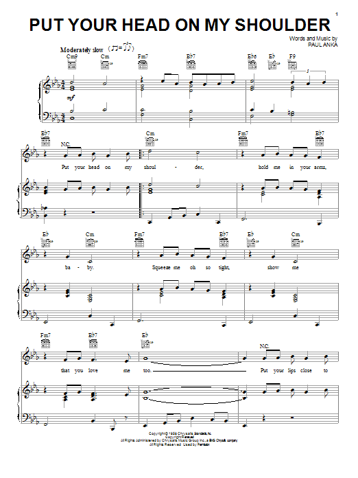 Download or print Paul Anka Put Your Head On My Shoulder sheet music, chords and digital score arranged for Lead Sheet / Fake Book. This Pop score includes 1 page(s).