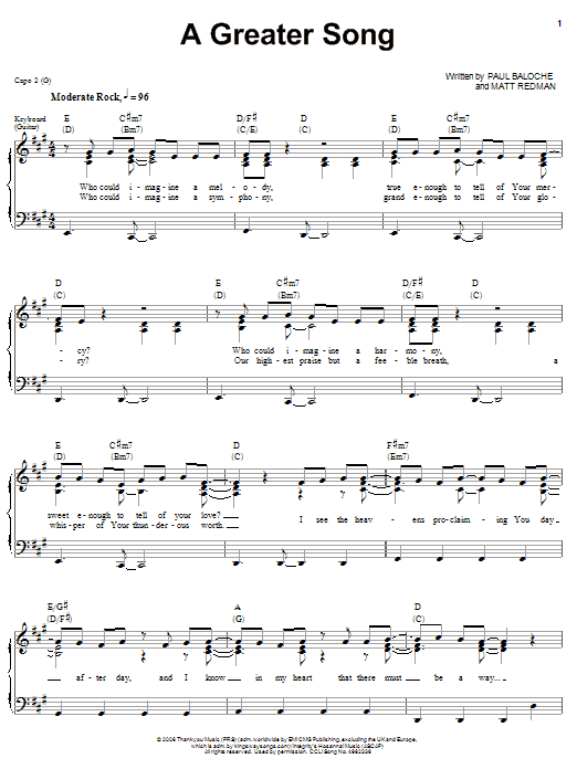 Download or print Paul Baloche A Greater Song sheet music, chords and digital score arranged for Piano, Vocal & Guitar Chords (Right-Hand Melody). This Christian score includes 5 page(s).