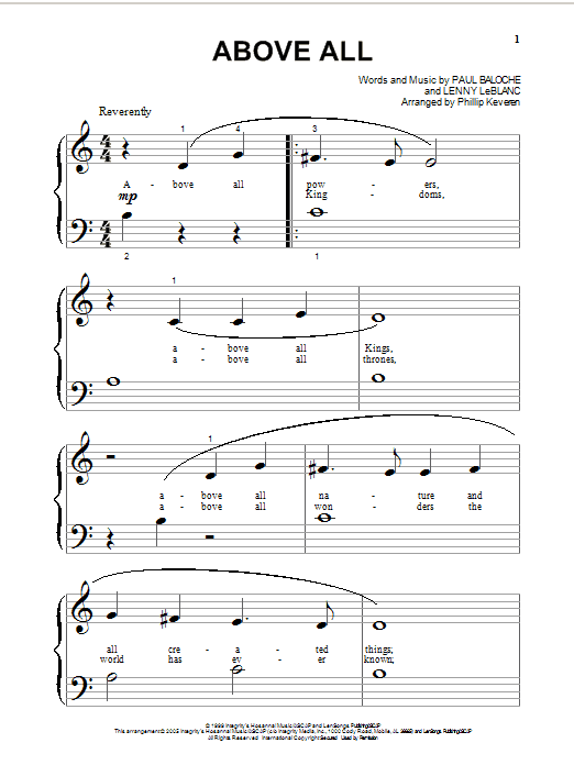 Download or print Paul Baloche Above All (arr. Phillip Keveren) sheet music, chords and digital score arranged for Piano Solo. This Christian score includes 4 page(s).