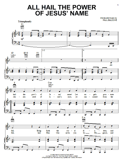 Download or print Paul Baloche All Hail The Power Of Jesus' Name sheet music, chords and digital score arranged for Piano, Vocal & Guitar Chords (Right-Hand Melody). This Christian score includes 7 page(s).