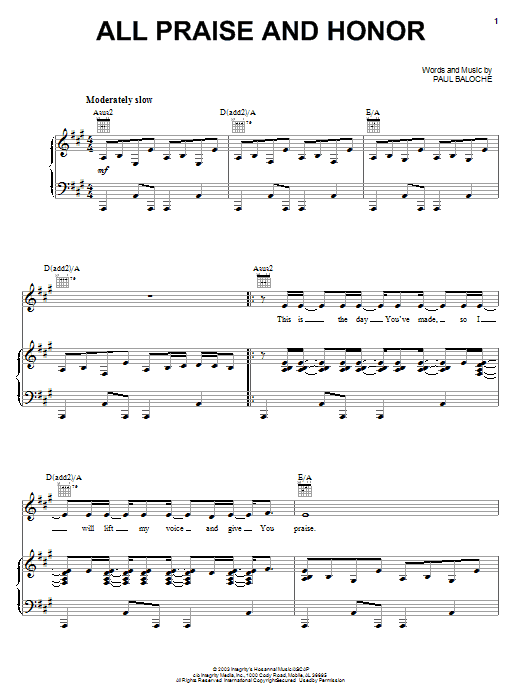 Download or print Paul Baloche All Praise And Honor sheet music, chords and digital score arranged for Piano, Vocal & Guitar Chords (Right-Hand Melody). This Christian score includes 6 page(s).
