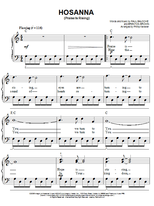 Download or print Paul Baloche Hosanna (Praise Is Rising) (arr. Phillip Keveren) sheet music, chords and digital score arranged for Easy Piano. This Praise & Worship score includes 4 page(s).