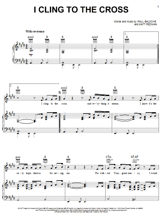 Download or print Paul Baloche I Cling To The Cross sheet music, chords and digital score arranged for Piano, Vocal & Guitar Chords (Right-Hand Melody). This Christian score includes 6 page(s).