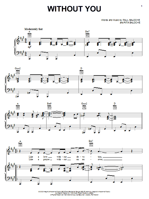 Download or print Paul Baloche Without You sheet music, chords and digital score arranged for Piano, Vocal & Guitar Chords (Right-Hand Melody). This Christian score includes 6 page(s).