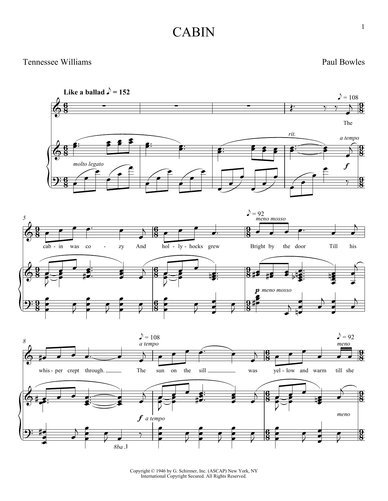 Download or print Paul Bowles Cabin sheet music, chords and digital score arranged for Piano & Vocal. This Classical score includes 2 page(s).
