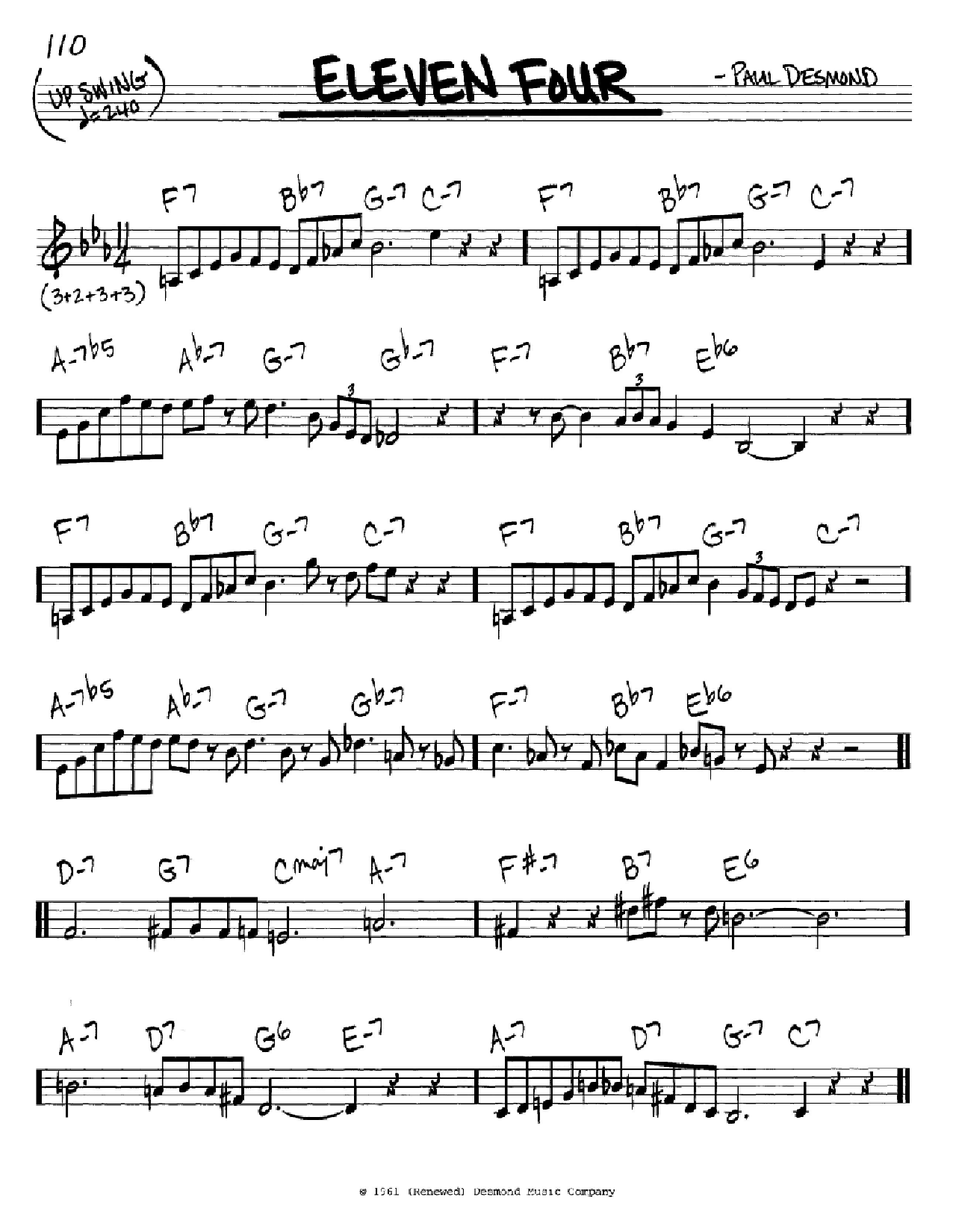 Download or print Paul Desmond Eleven Four sheet music, chords and digital score arranged for Real Book – Melody & Chords – C Instruments. This Jazz score includes 2 page(s).