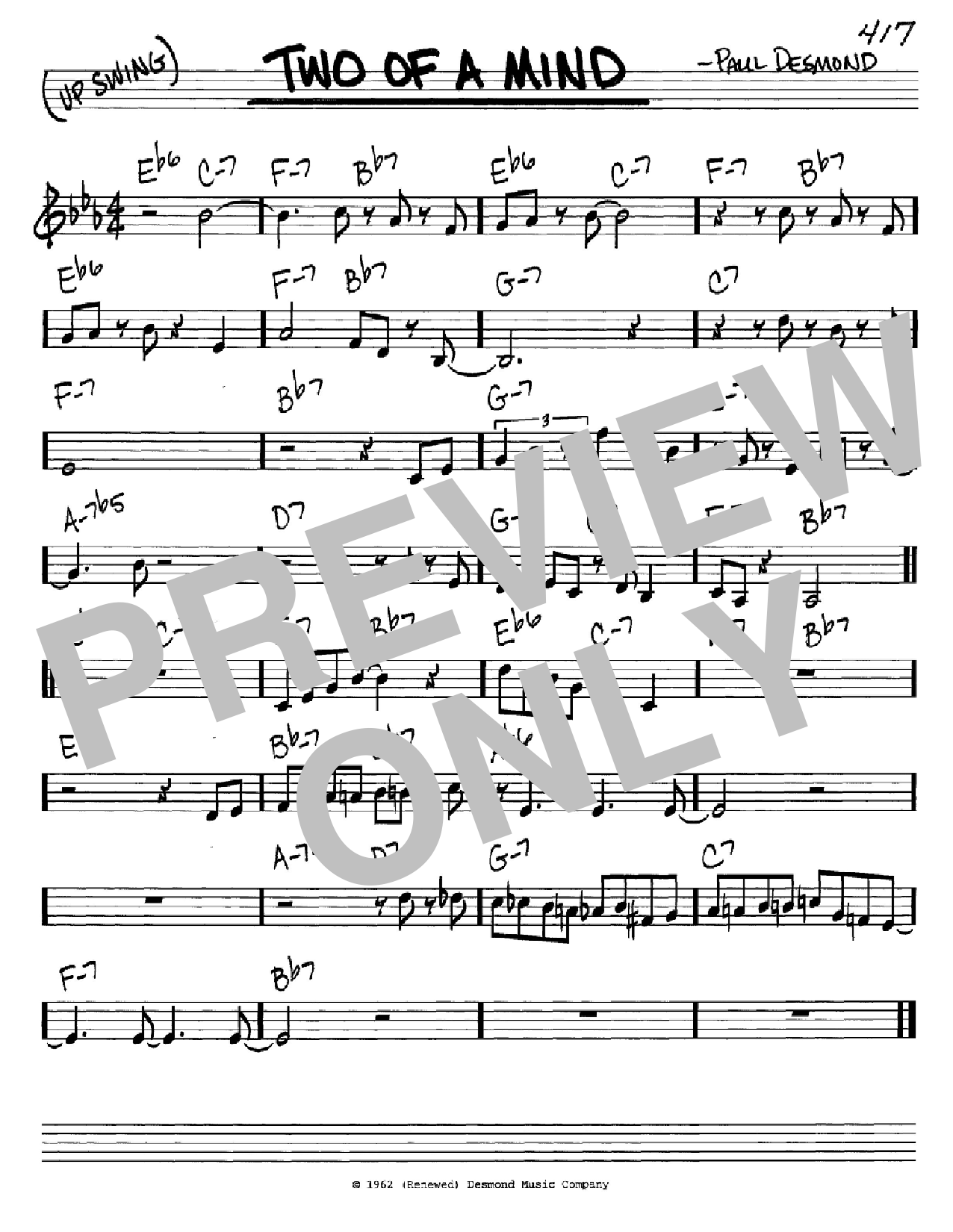 Download or print Paul Desmond Two Of A Mind sheet music, chords and digital score arranged for Real Book – Melody & Chords – C Instruments. This Jazz score includes 1 page(s).