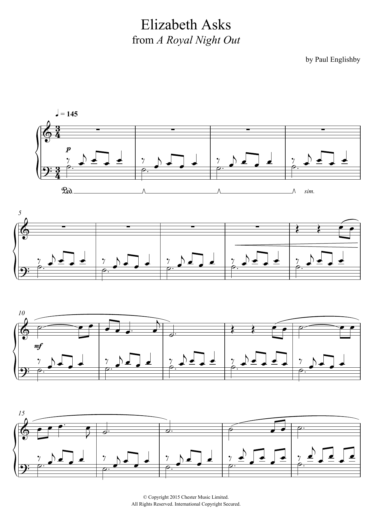 Download or print Paul Englishby Elizabeth Asks (From 'A Royal Night Out') sheet music, chords and digital score arranged for Piano Solo. This Film/TV score includes 2 page(s).