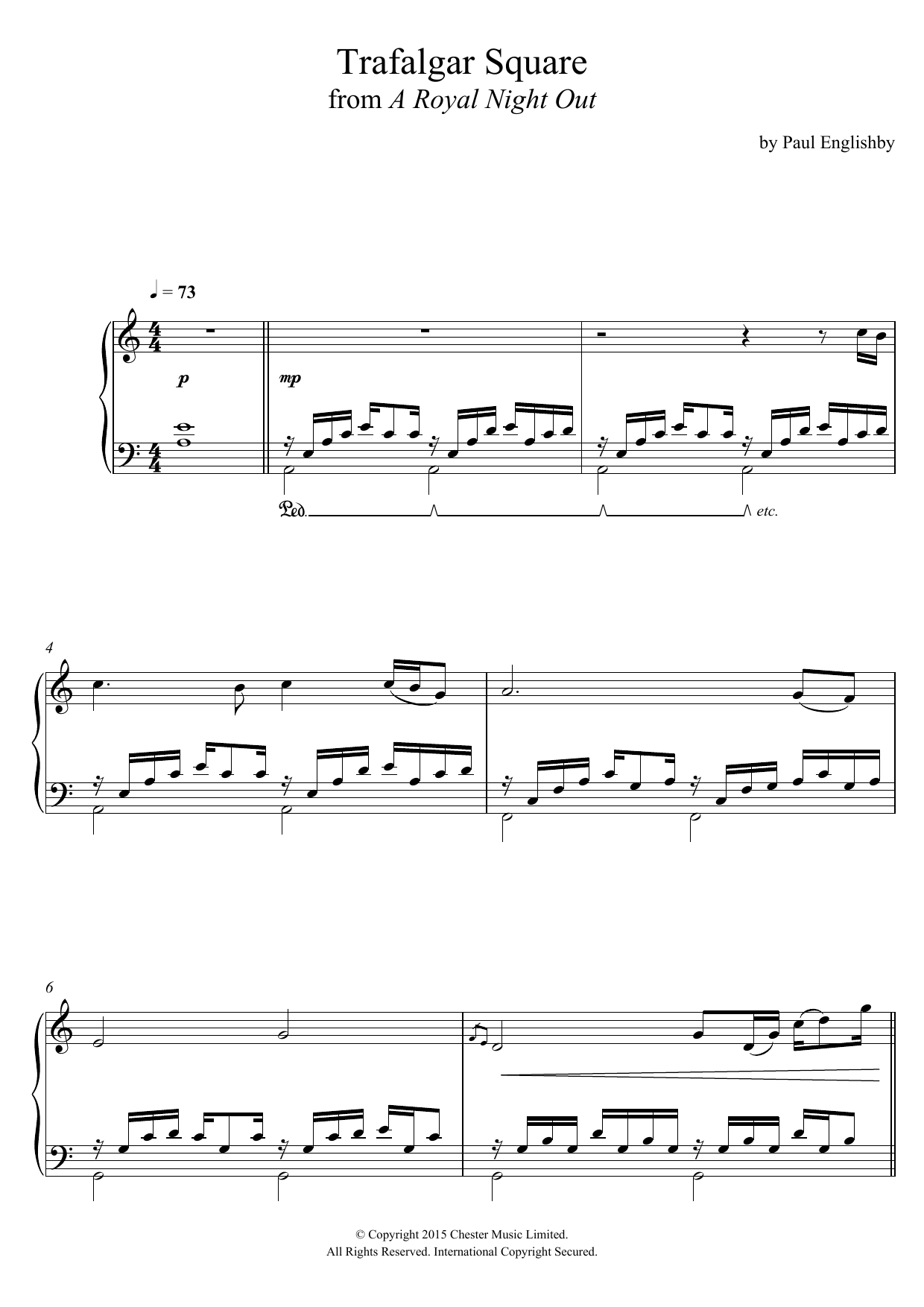 Download or print Paul Englishby Trafalgar Square (From 'A Royal Night Out') sheet music, chords and digital score arranged for Piano Solo. This Film/TV score includes 2 page(s).