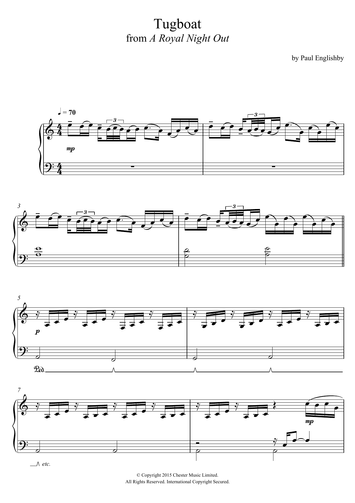 Download or print Paul Englishby Tugboat (From 'A Royal Night Out') sheet music, chords and digital score arranged for Piano Solo. This Film/TV score includes 2 page(s).