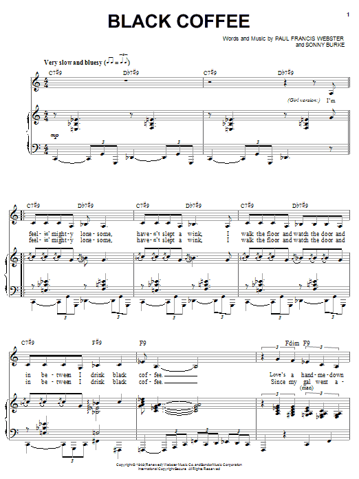 Download or print Paul Francis Webster Black Coffee sheet music, chords and digital score arranged for Real Book – Melody & Chords – Eb Instruments. This Jazz score includes 1 page(s).