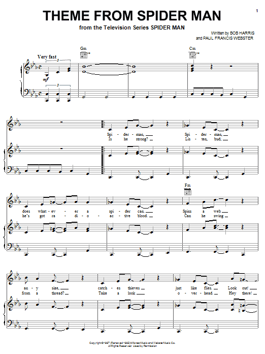Download or print Paul Francis Webster Theme From Spider-Man sheet music, chords and digital score arranged for Easy Piano. This Children score includes 3 page(s).
