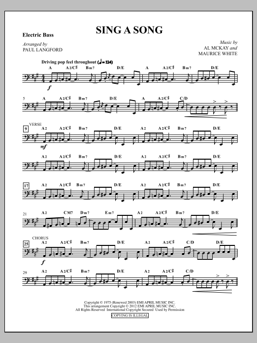 Download or print Paul Langford Sing A Song - Bass sheet music, chords and digital score arranged for Choir Instrumental Pak. This Disco score includes 3 page(s).