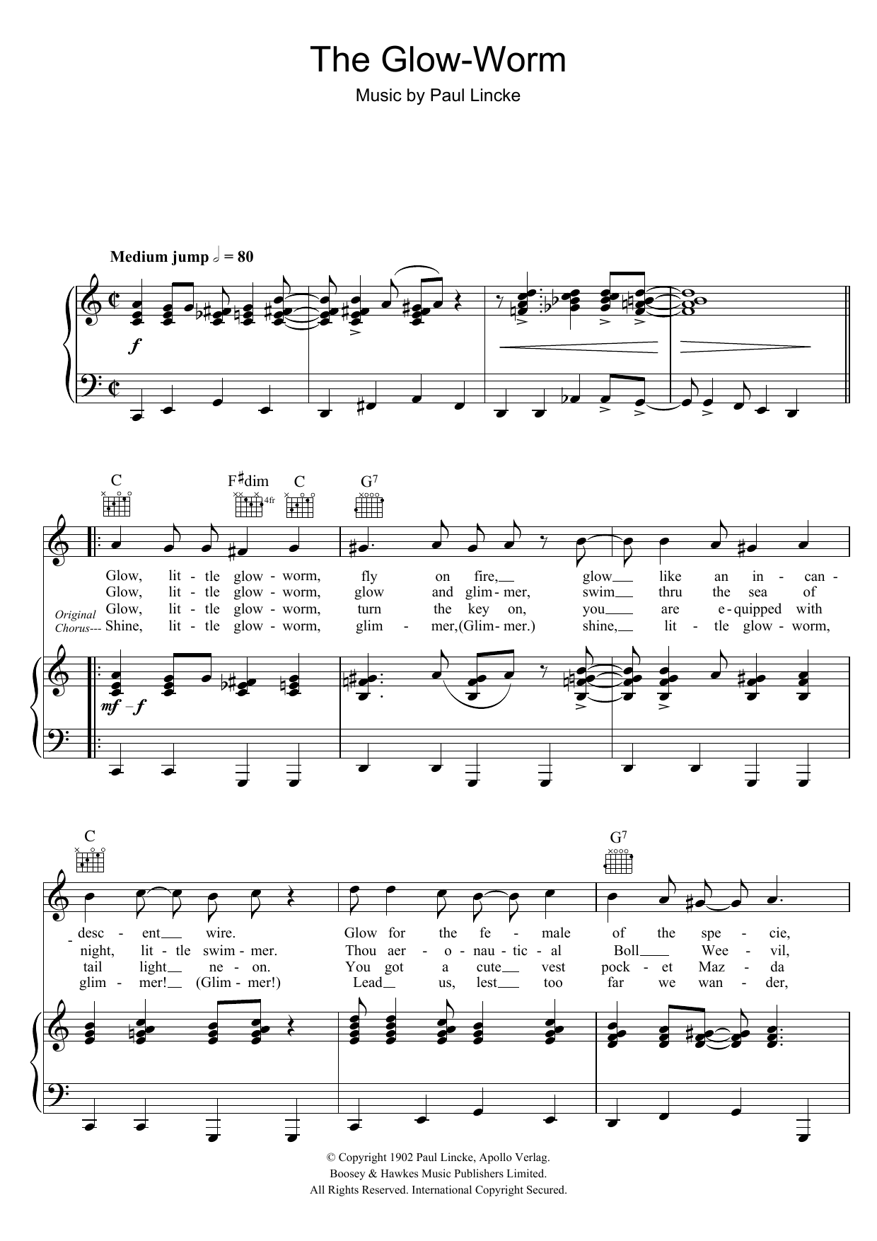 Download or print Paul Lincke The Glow-Worm sheet music, chords and digital score arranged for Piano, Vocal & Guitar Chords. This Standards score includes 3 page(s).