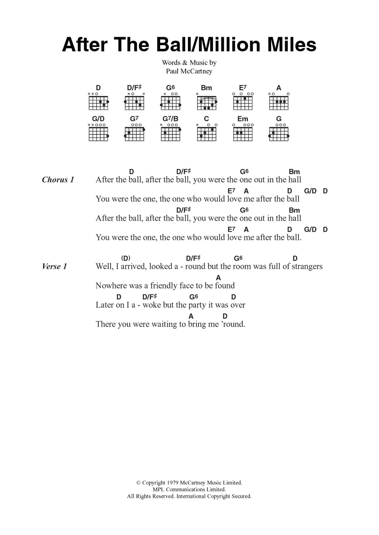 Download or print Paul McCartney After The Ball/Million Miles sheet music, chords and digital score arranged for Guitar Chords/Lyrics. This Pop score includes 2 page(s).