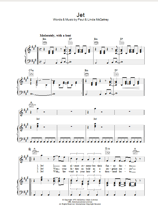 Download or print Paul McCartney & Wings Jet sheet music, chords and digital score arranged for Piano, Vocal & Guitar Chords (Right-Hand Melody). This Pop score includes 5 page(s).