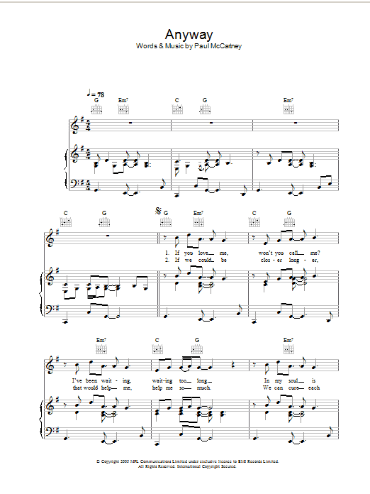 Download or print Paul McCartney Anyway sheet music, chords and digital score arranged for Piano, Vocal & Guitar Chords. This Pop score includes 4 page(s).
