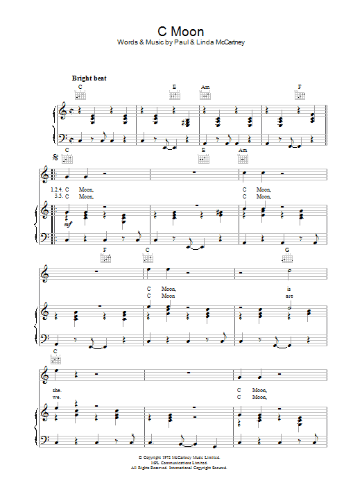 Download or print Paul McCartney C Moon sheet music, chords and digital score arranged for Piano, Vocal & Guitar Chords. This Pop score includes 3 page(s).