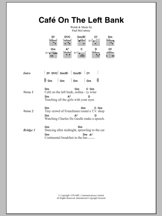 Download or print Paul McCartney Cafe On The Left Bank sheet music, chords and digital score arranged for Guitar Chords/Lyrics. This Pop score includes 2 page(s).