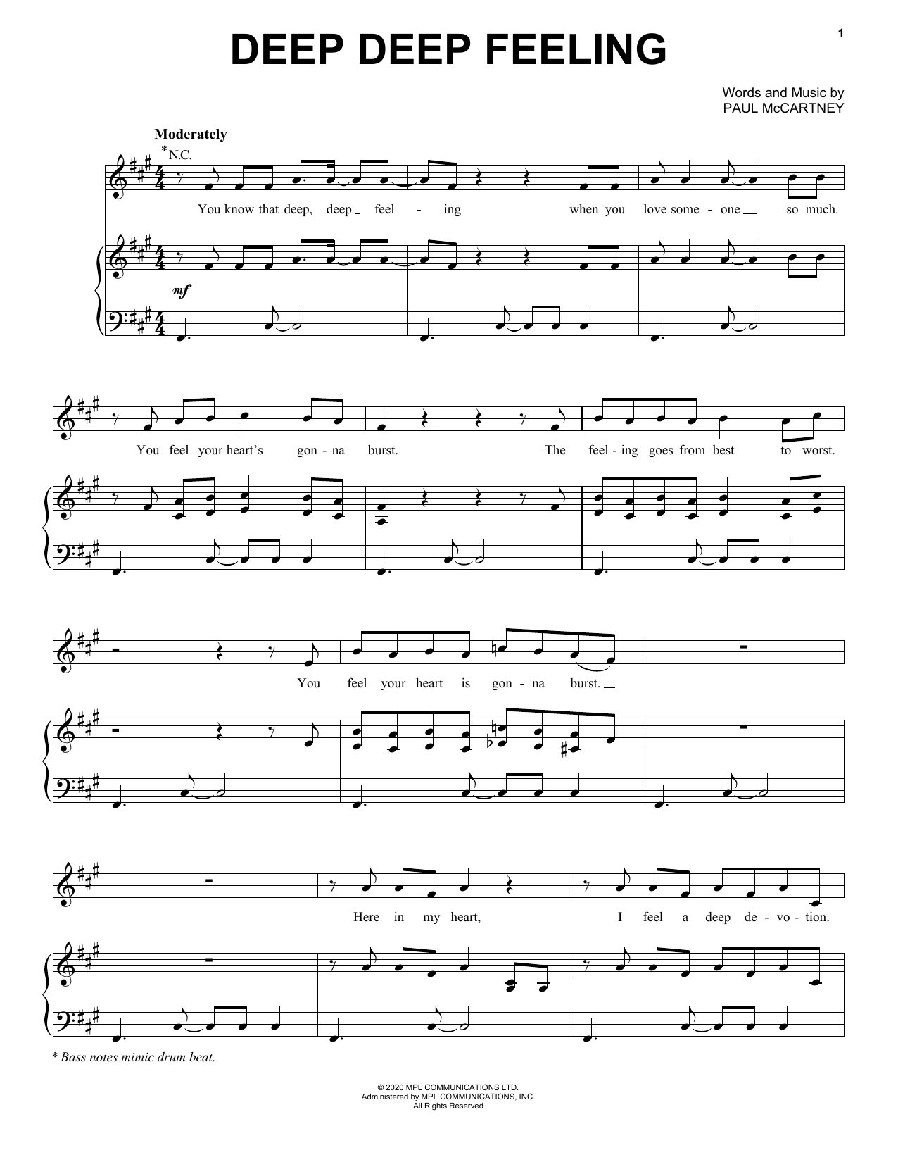 Download or print Paul McCartney Deep Deep Feeling sheet music, chords and digital score arranged for Piano, Vocal & Guitar Chords (Right-Hand Melody). This Pop score includes 16 page(s).