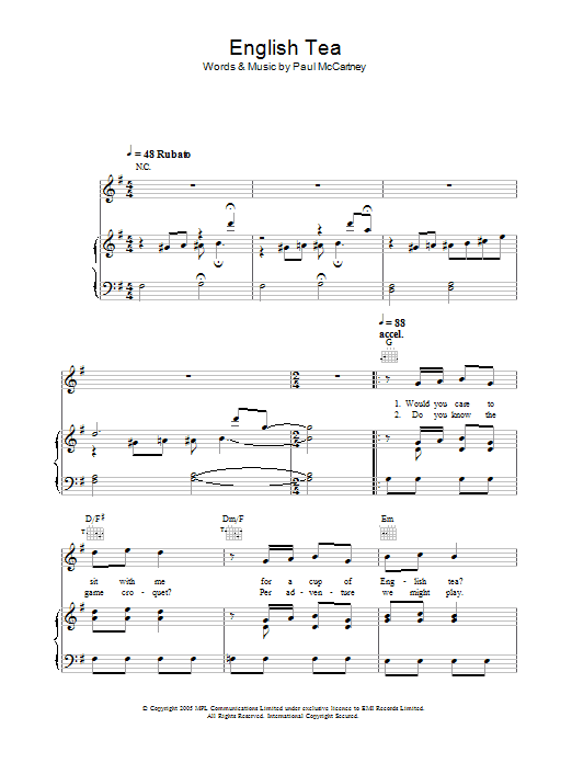 Download or print Paul McCartney English Tea sheet music, chords and digital score arranged for Lead Sheet / Fake Book. This Pop score includes 2 page(s).