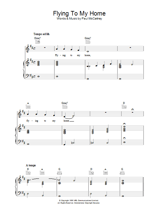 Download or print Paul McCartney Flying To My Home sheet music, chords and digital score arranged for Guitar Chords/Lyrics. This Rock score includes 2 page(s).