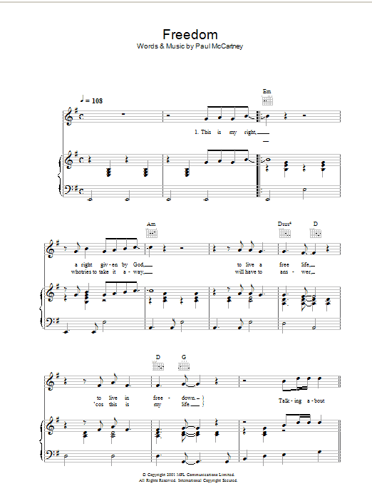 Download or print Paul McCartney Freedom sheet music, chords and digital score arranged for Easy Piano. This Pop score includes 3 page(s).