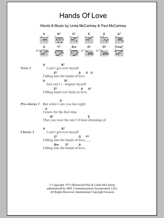 Download or print Paul McCartney Hands Of Love sheet music, chords and digital score arranged for Guitar Chords/Lyrics. This Rock score includes 2 page(s).