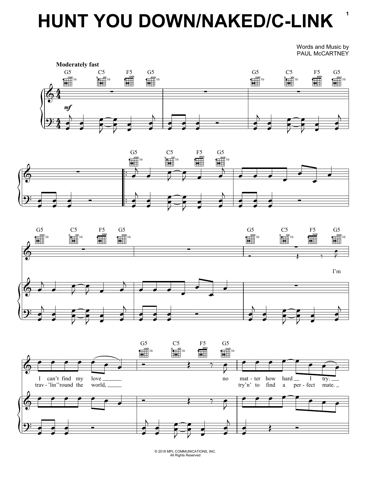 Download or print Paul McCartney Hunt You Down sheet music, chords and digital score arranged for Piano, Vocal & Guitar Chords (Right-Hand Melody). This Pop score includes 10 page(s).