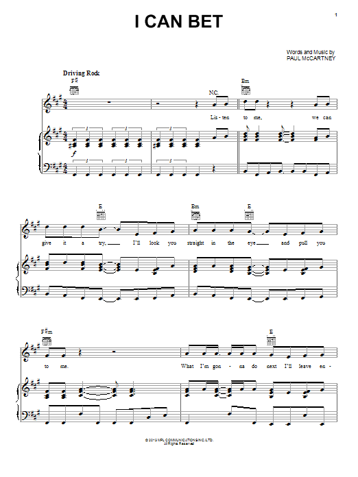 Download or print Paul McCartney I Can Bet sheet music, chords and digital score arranged for Piano, Vocal & Guitar Chords (Right-Hand Melody). This Pop score includes 6 page(s).