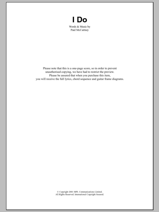 Download or print Paul McCartney I Do sheet music, chords and digital score arranged for Guitar Chords/Lyrics. This Rock score includes 2 page(s).
