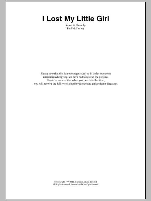 Download or print Paul McCartney I Lost My Little Girl sheet music, chords and digital score arranged for Guitar Chords/Lyrics. This Rock score includes 2 page(s).