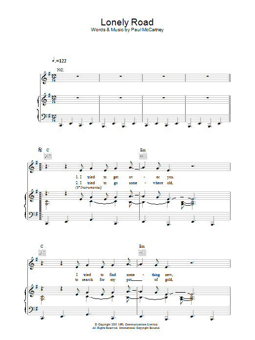 Download or print Paul McCartney Lonely Road sheet music, chords and digital score arranged for Piano, Vocal & Guitar Chords. This Pop score includes 4 page(s).