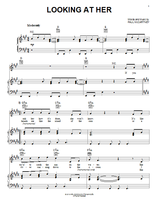 Download or print Paul McCartney Looking At Her sheet music, chords and digital score arranged for Piano, Vocal & Guitar Chords (Right-Hand Melody). This Pop score includes 5 page(s).