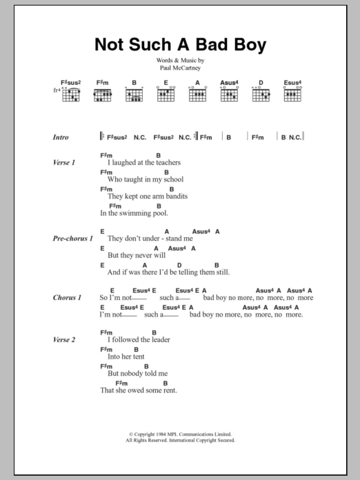 Download or print Paul McCartney Not Such A Bad Boy sheet music, chords and digital score arranged for Guitar Chords/Lyrics. This Rock score includes 2 page(s).