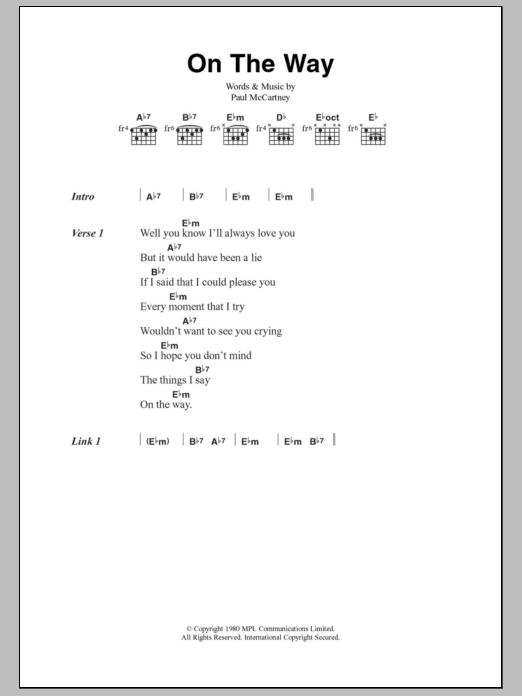 Download or print Paul McCartney On The Way sheet music, chords and digital score arranged for Guitar Chords/Lyrics. This Rock score includes 2 page(s).